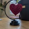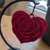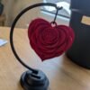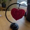 Chaque détail de cette rose d’un rouge profond a été pensé pour captiver le regard. Ses strates finement superposées forment un cœur parfait et texturé, visible sous tous les angles. Suspendu délicatement à son élégant support noir en forme de croissant, le cœur semble flotter dans les airs, ajoutant une dimension poétique et aérienne à la pièce.